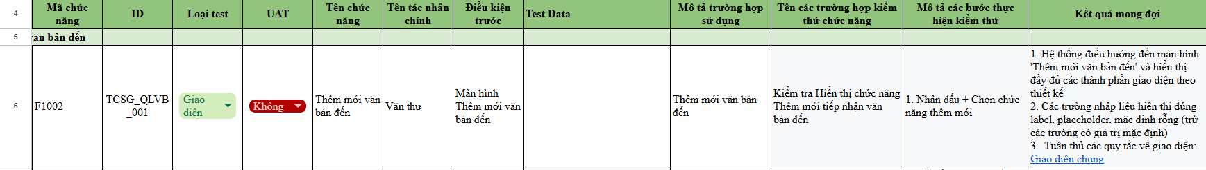 - ID test case: Dự án_module_xxx (xxx tăng dần liên tục). Ví dụ: TCSG_DHVB_001