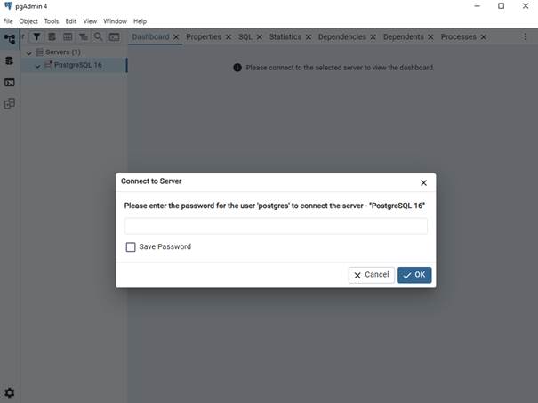 - Sau khi cài đặt xong tìm kiếm pgAdmin4 vào phần mềm như này thì đã setup thành công. Nhập mật khẩu như đã setup ở trên là thành công.