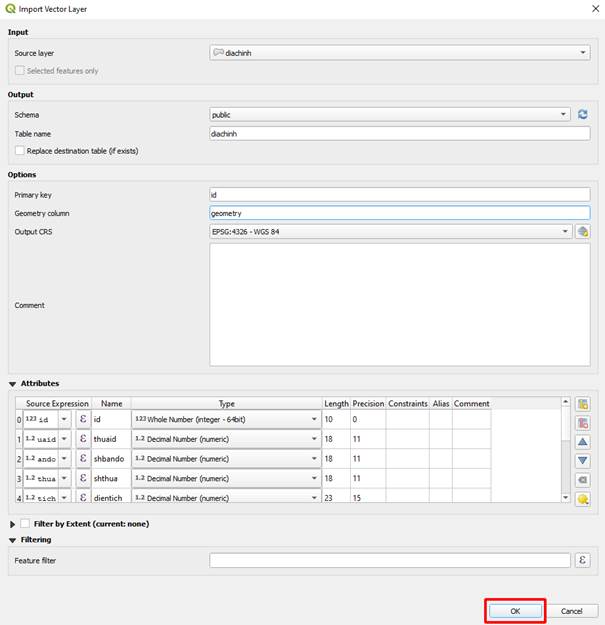 - Import dữ liệu vào database thông qua QGIS