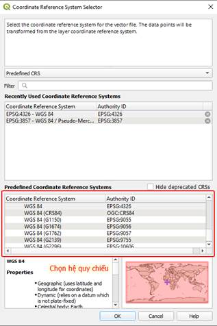 + Nhấn Browser để mở hộp thoại Coordinate Reference System selector, tại Coordinate Reference System chọn lưới chiếu muốn chuyển đổi: