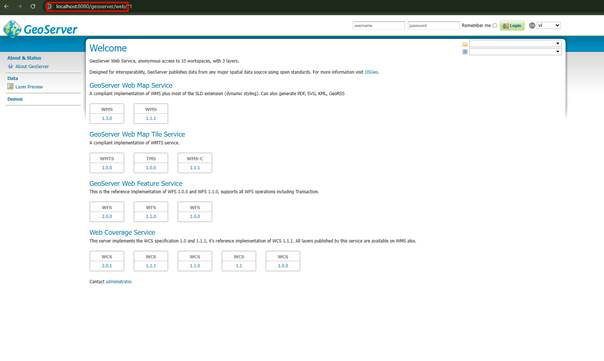 - Username đăng nhập là admin, Password là geoserver mặc định là ở cổng localhost:8080