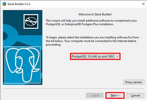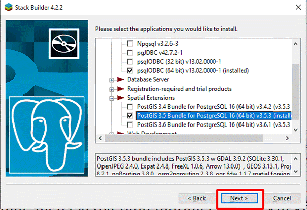- Lưu ý cần cài đúng phiên bản Postgresql 16.x để đồng bộ với máy chủ. Và cài đặt Postgis 3.5.3 , next đến khi cài đặt xong.