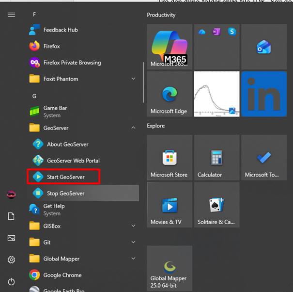 - Sau khi setup xong, vào và chạy với Start Geoserver để bắt đầu