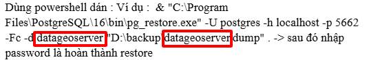 - Dùng powershell dán : Ví dụ : & "C:\Program Files\PostgreSQL\16\bin\pg_restore.exe" -U postgres -h localhost -p 5662 -Fc -d datageoserver "D:\backup\datageoserver.dump" . -> sau đó nhập password là hoàn thành restore