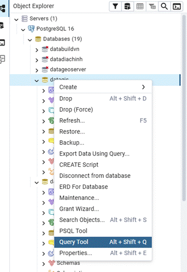 Chuột phải database → Query Tool → chạy: