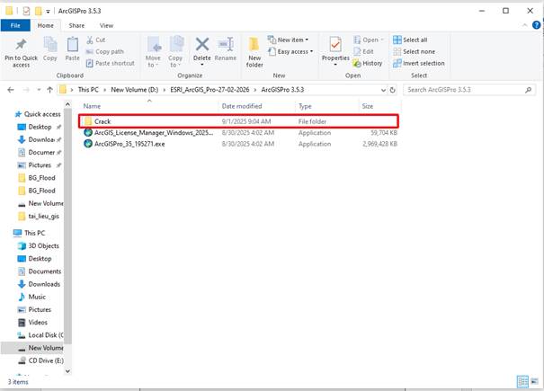- Sau khi cài đặt xong ta chưa sử dụng được ngay mà còn phải crack nữa mới sử dụng được. Trong mục ArcgisPro 3.5.3 có thư mục Crack