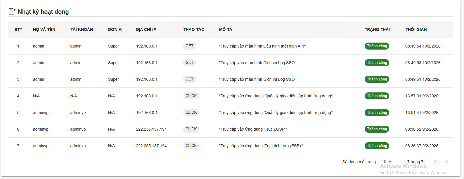 Audit log là dữ liệu ghi nhận: